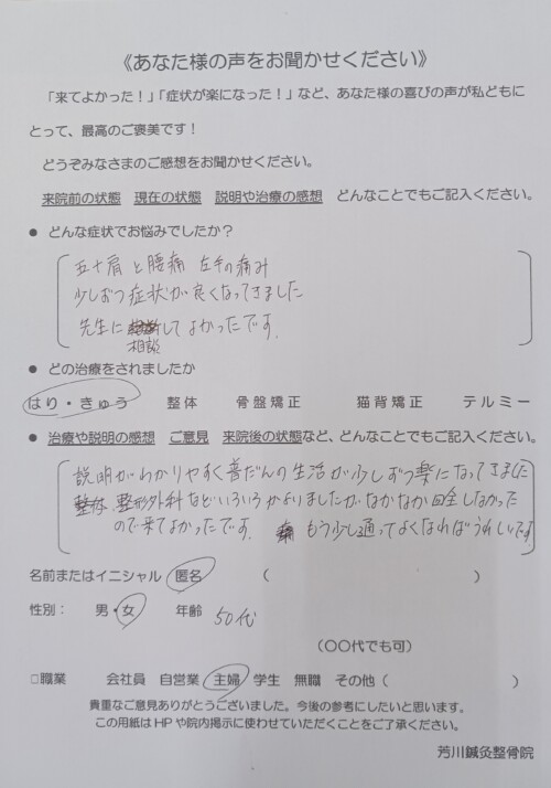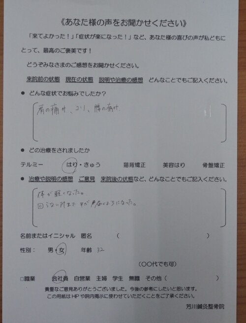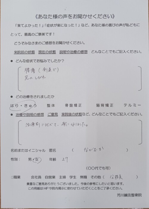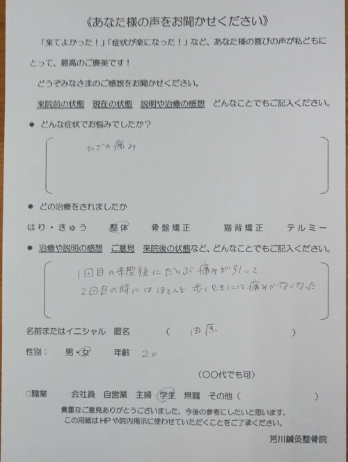 ●治療や説明の感想 ご意見 来院後の状態 など、どんなことでもご記入ください。 初めてのはりとお灸でしたが、ご丁寧に説明をしてくださり安心できました。 首・肩こりが楽になり寝つきも良くなってきました。 自宅でできるトレーニングなども教えてくださってありがとうございました!!