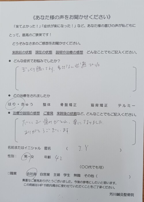 ●治療や説明の感想 ご意見 来院後の状態 など、どんなことでもご記入ください。 だいぶ痛みがとれ、楽になりました。 ありがとうございます。