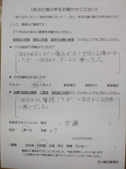 体をひねるとすごい痛みがあり、生活に支障があったが一回目でずいぶん楽になった。