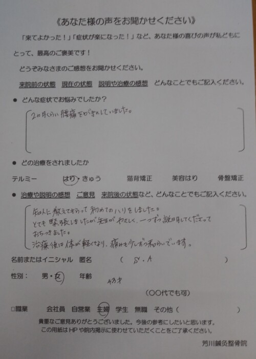 治療後は体が軽くなり、痛みも少しずつ和らいでいます。