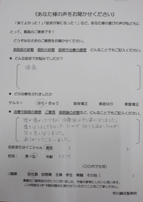 芳川鍼灸整骨院は、あなたの悩みを丁寧にお聞きし、原因や施術方法、料金をしっかりとお伝えいたします。
