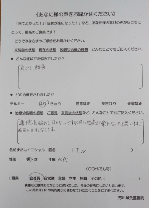 通院を始めて間もないですが特に腰痛が楽になったと思います!!
